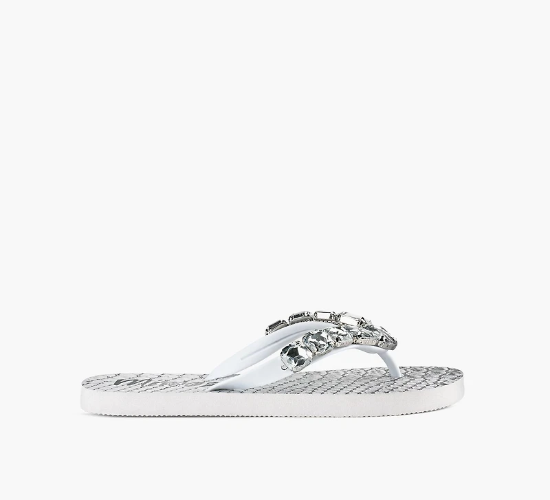 Just because a style may be a staple, doesn't mean it has to be dull. At least, that's what Mimosa's Vidal flip flops lead us to believe. Cut to a classic thong profile, this pair sits on a cushioned rubber sole featuring a printed insole that subtly stands out with every step. Their pièce de résistance, however, lies in their crystal-appliquéd straps, certain to send flecks of light dancing as you move.