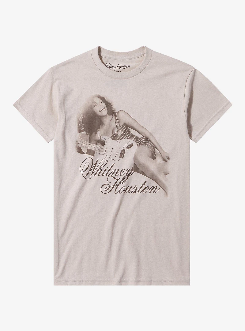 We'll always love Whitney, so grab a new tee repping the pop icon. This one shows Whitney Houston laying next to an electric guitar. Please note: Style runs large; size down for a tighter fit.