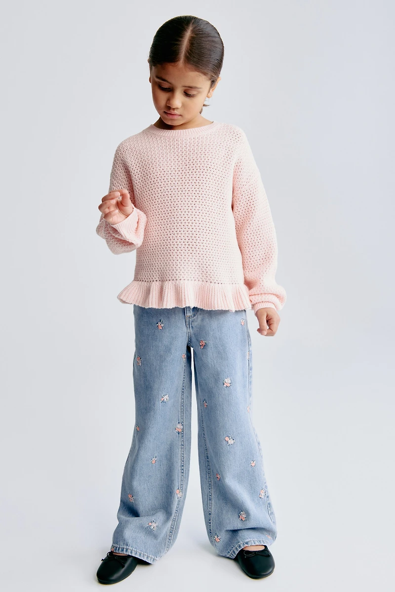 5-pocket jeans in soft, cotton-blend denim with motif details. Loose fit through hip and thigh. Adjustable elastic at waistband, zip fly with snap fastener, and wide legs.