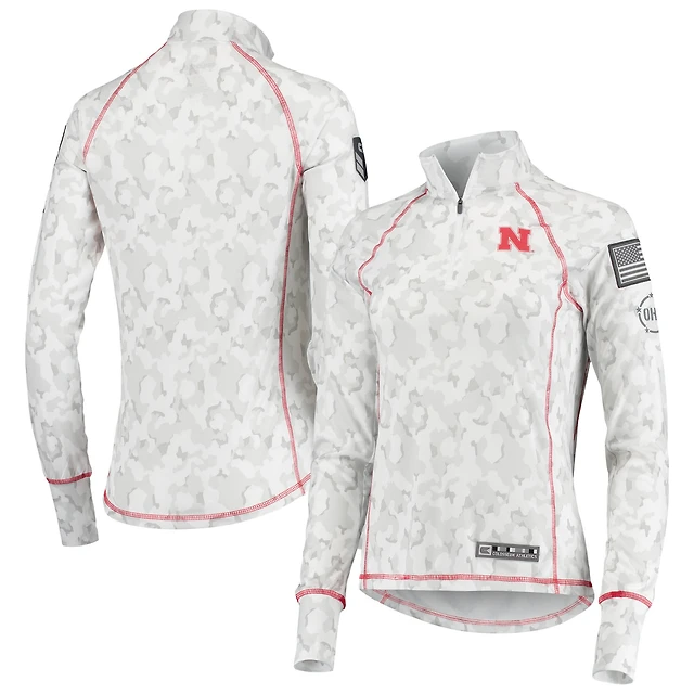 Women's Colosseum White Nebraska Huskers OHT Military Appreciation Officer Arctic Camo Fitted Lightweight 1/4-Zip Jacket