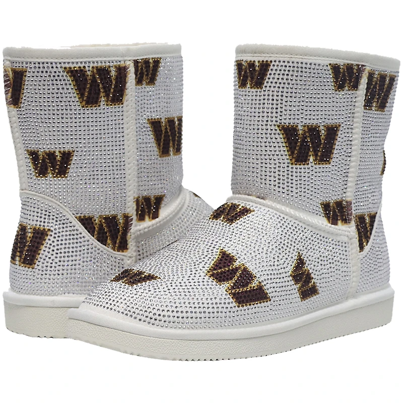 Show off your Washington Commanders spirit from head to toe with these Logo Pull on Ankle Boots from Cuce. Adorned with clear rhinestone accents and an all-over team logo print topped with even more crystal accents, these boots let you flaunt your Washington Commanders pride in a dazzling way. The thick faux fur lining provides a cozy and comfortable fit, perfect for keeping your feet warm on chilly game days.