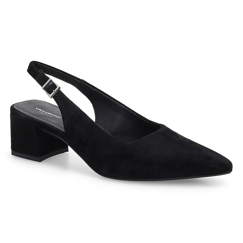 The Marta by Vagabond is a timeless slingback heel with an elegant profile. Marta is crafted from black leather with a pointed toe shape and an adjustable slingback strap. The adjustable slingback strap features a classic gold-coloured buckle. The block heel of this shoe is 50 mm, and the leather lining will envolope the foot.