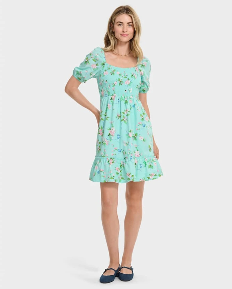• FEATURES: Allover floral bird print, smocked bodice, tiered hem with ruffle trim