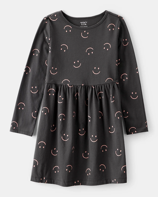 Girls Smile Print Long Sleeve Cotton Dress - Black