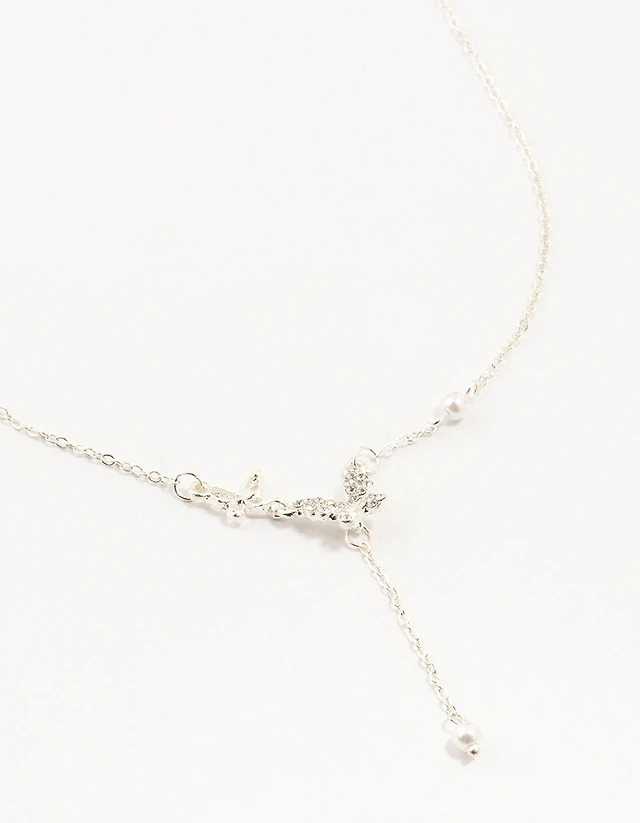 Silver Diamante Butterfly & Pearl Y-Necklace