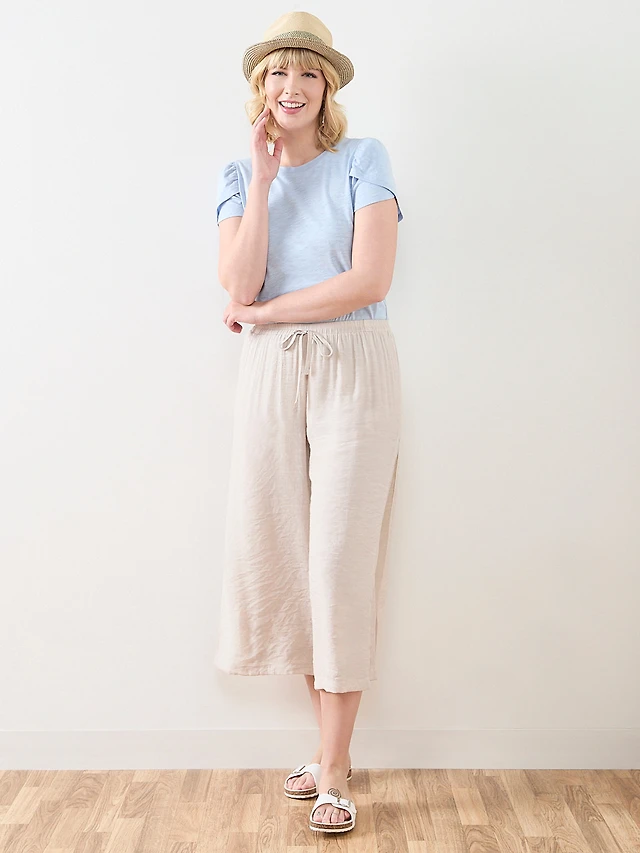 Petite Elbow-Sleeve Gathered Neck Top