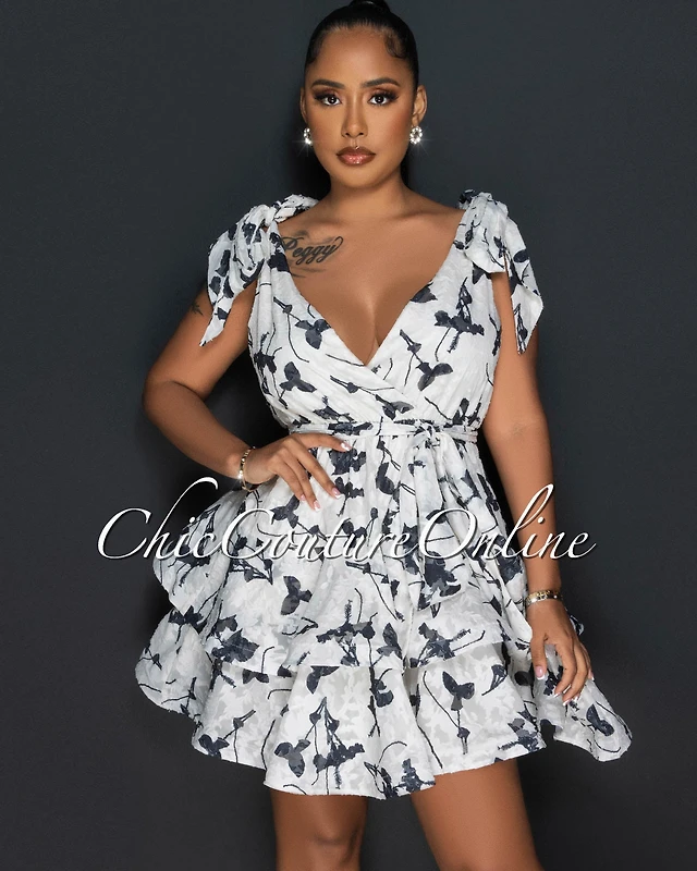 Loleen Ivory Black Cream Print Textured Ruffle Skater Dress