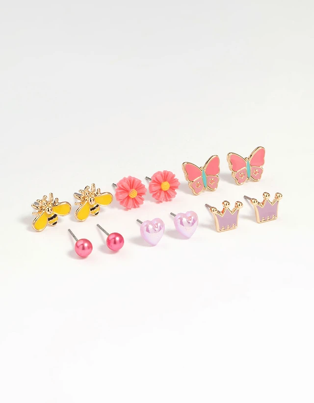 Kids Gold Tiara & Bee Stud Earrings 6-Pack