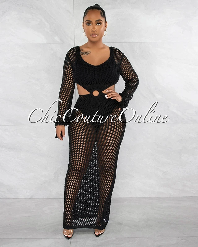 *Rhonda Black "O" Ring Crochet Cut-Out Cover-Up Maxi Dress