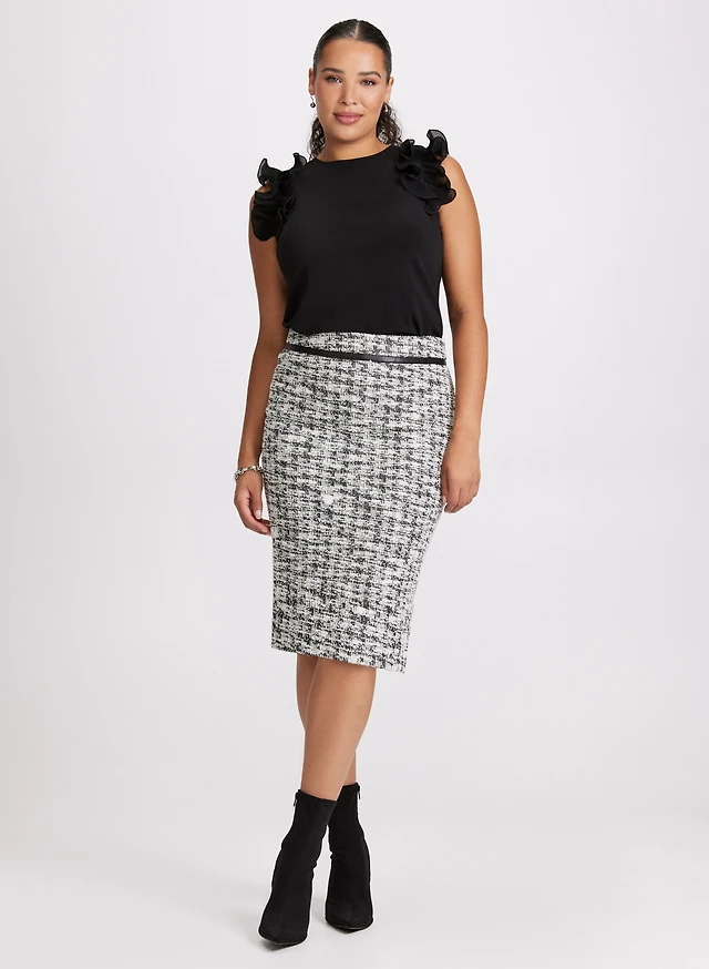 Sleeveless Ruffled Shoulder Top & Houndstooth Pencil Skirt