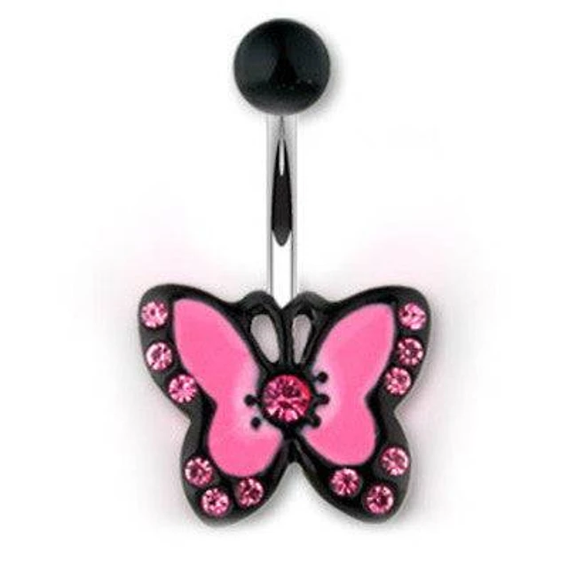 Surgical Steel Pink & Black CZ Gem Butterfly Belly Button Navel Ring