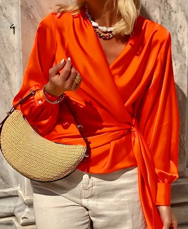 Orange Satin Long Sleeve V-Neck Blouse with One -Sided Tie