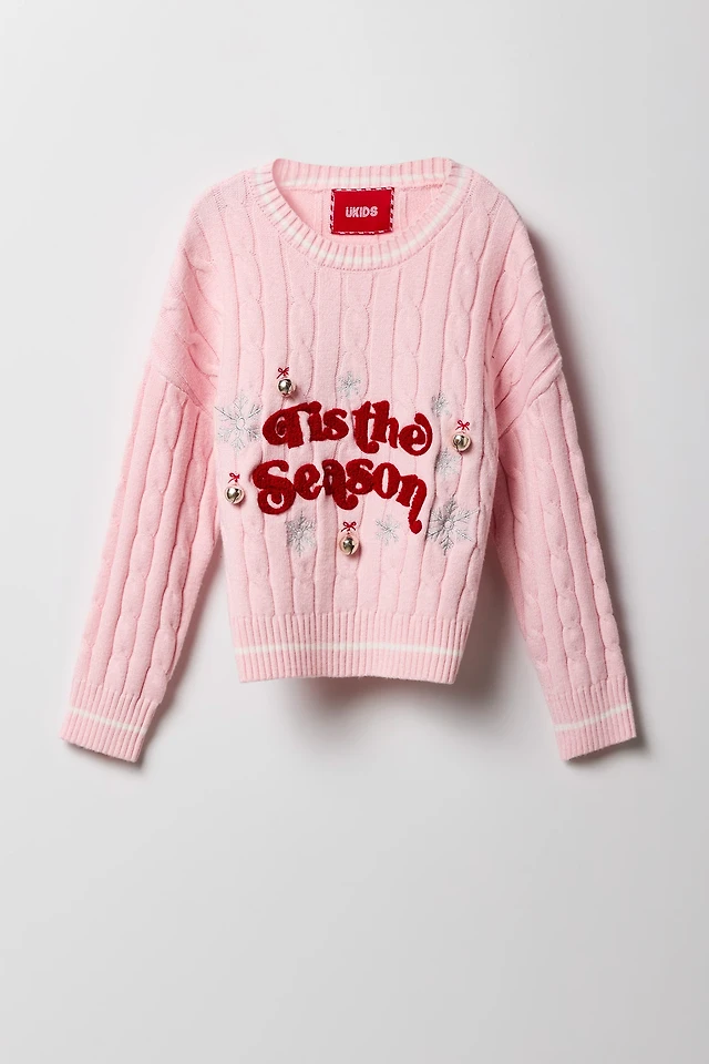 Girls Christmas Chenille Embroidered Cable Knit Sweater